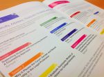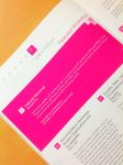 The inside pages of the book are printed full-color on dull stock, continuing the look of the simple square shapes and clean lines used in the group’s earlier marketing materials. The pages continue the theme from the front cover of bringing the pieces together.